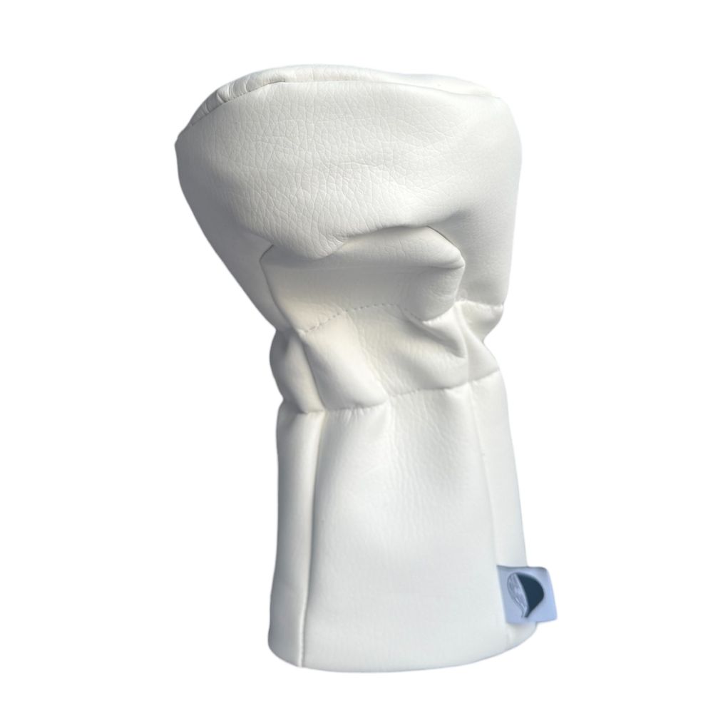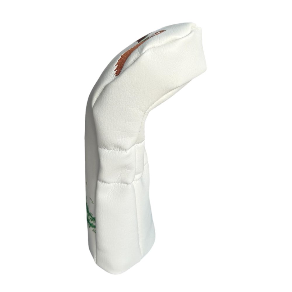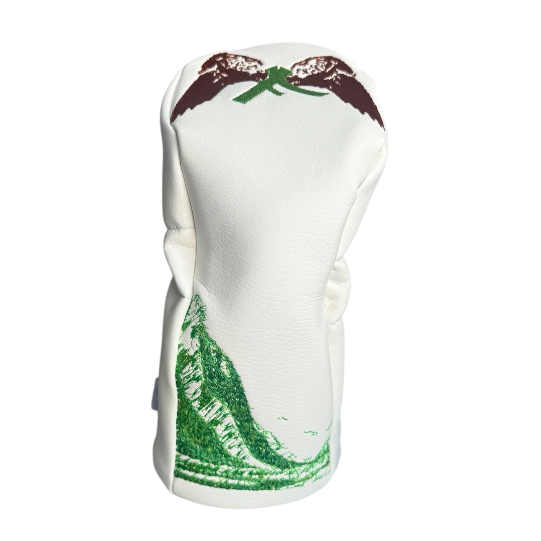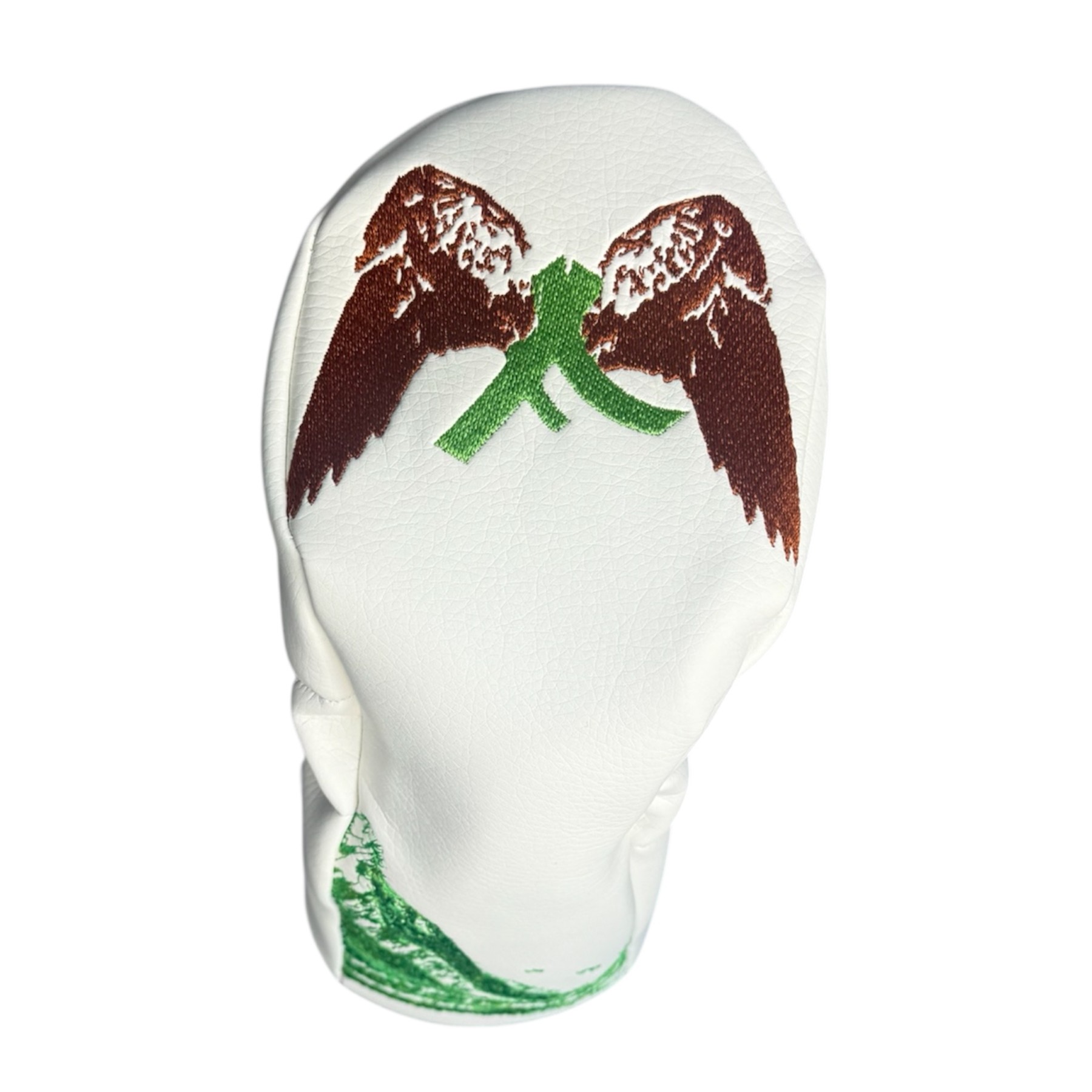 Weiße Fairway-Holz-Golfschlägerhaube aus hochwertigem, griffigem Kunstleder mit aufwendiger Stickerei brauner Adlerflügel mit zentralem Buchstaben F Motiv für Fairway Holz. Die Vorderseite zeigt zusätzlich eine detailreiche grüne Berglandschaft am unteren Rand, die der Haube einen sportlich-alpinen Look verleiht und sie ideal für Golfer macht, die ein individuelles, naturverbundenes Design auf dem Platz möchten.